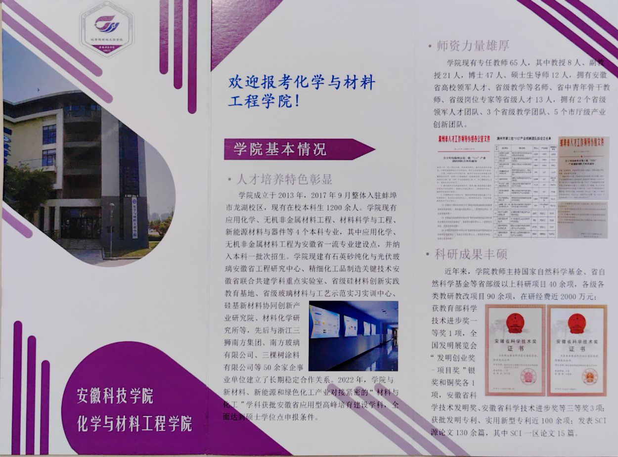 为积极应对新旧高考志愿填报模式转变可能带来的生源质量变化挑战,化学与材料工程学院在高质量完成学校下达的招生宣传任务基础上,学院还制作了“欢迎报考爱体育平台化学与材料工程学院”H5易企秀,组织师生利用微信群、QQ群宣传;学院印制了“欢迎报考化学与材料工程学院”纸质宣传册子,随同学校的宣传材料一并发放,主动向有化学及材料类报考意愿的考生及家长介绍学院,吸引考生关注学院。