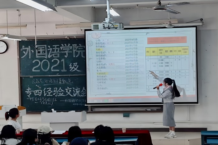 翻译专业在求知楼A203教室举行。李妞妞表明听力和作文要分段作答,平时注意积累高级词汇,鼓励同学们树立良好的心态积极应考;余忆敏同样推荐了使用英语学习软件背单词,强调听力练习,提出精听和泛听相结合,通过阅读外刊增加词汇量;施怡则强调了做真题写作文的重要性。