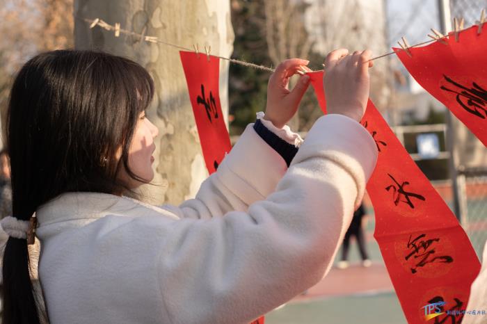 书美协会副会长王广顺积极向大家介绍:“我们的送春联活动为大家准备了各式各样的春联,包括传统的对联和现代的创意对联,内容涵盖了新年祝福、励志寄语、家庭和谐等多个方面。”道路旁也挂起了各式各样的书法字画以及春联,皆是由书美协会的各位成员所作。书美协会的成员还特意准备了精美的小礼品,赠送给积极参与活动的同学们。协会的书法老师们也在现场为大家提供了书法指导,让大家能够亲自体验书法的魅力,现场气氛十分热烈。