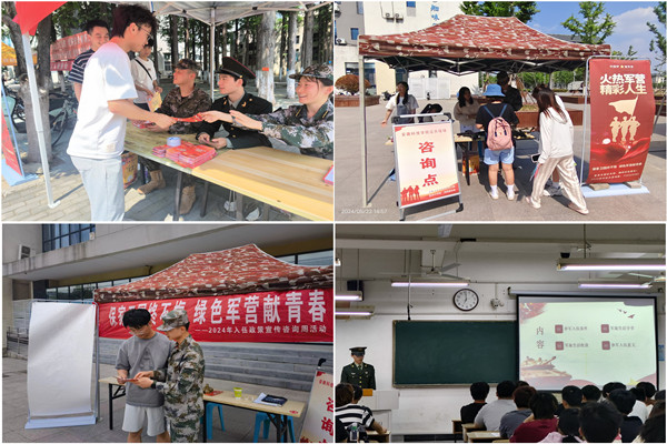 为加强应征入伍宣传力度,营造浓厚的参军报国氛围,鼓励毕业生响应国家号召,在火热军营中实现精彩人生,学校征兵工作站自5月22日起,依托“一站式”学生社区在两校区开展了以“火热军营 精彩人生”为主题的应征入伍政策宣传咨询周系列活动。