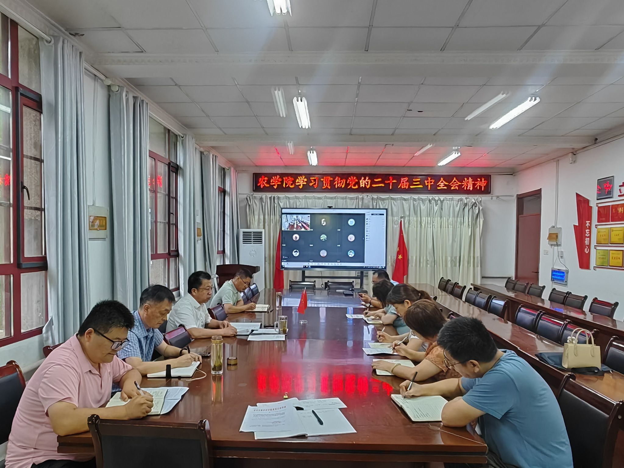 7月27日上午,农学院党委在学院会议室以线上线下相结合方式召开学院理论学习中心组扩大会,专题传达学习党的二十届三中全会精神,并就如何贯彻落实做出进一步安排。学院党委委员,纪委委员,各党支部书记、副书记,工会主席,团委书记和组织员参加会议,会议由学院党委书记何世潮主持。