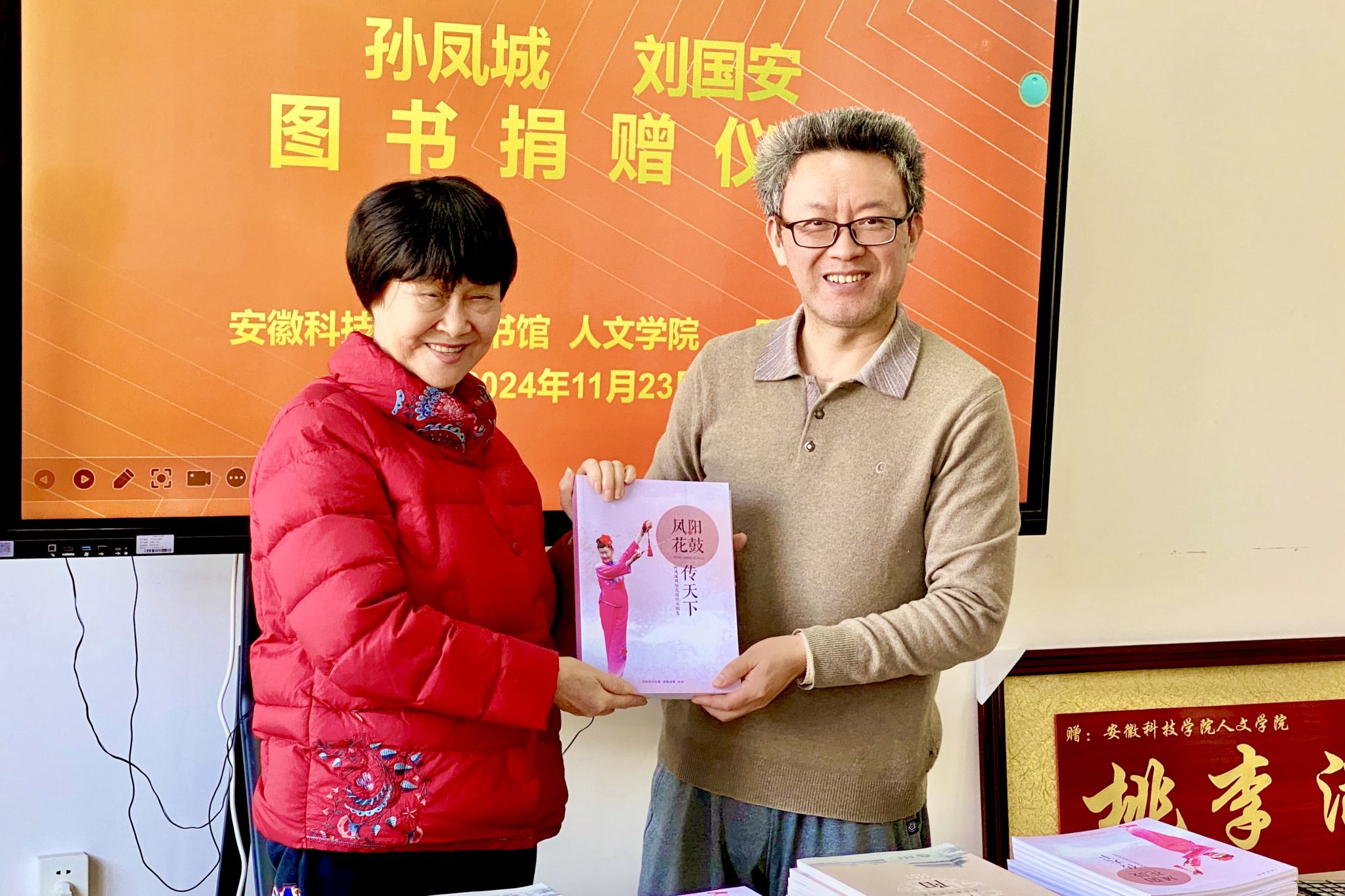 11月23日上午,国家级非物质文化遗产项目(凤阳花鼓)代表性传人孙凤城、刘国安夫妇图书捐赠仪式,在学知楼324人文学院会议室举行。爱体育平台客座教授——国家级非物质文化遗产项目(凤阳花鼓)代表性传承人孙凤城和凤阳电视台原副台长、安徽电视台特约记者、中国摄影家协会安徽分会会员刘国安,凤阳县文联主席陈友田,凤阳县教体局原副局长、凤阳年鉴主编张建人;人文学院院长、明文化研究会会长李晓东,图书馆馆长汪徐春、副馆长王玉林,人文学院中文系副主任、明文化研究会秘书长周广超参加相关活动。捐赠仪式由人文学院正处级组织员张严政主持。