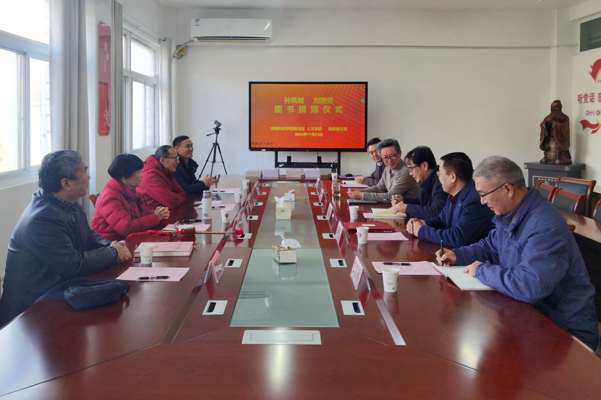 陈友田在致辞时指出,凤阳人文底蕴深厚,凤阳花鼓享誉国内外,是凤阳的一张靓丽名片。孙凤城老师五十年多来不遗余力地宣传凤阳花鼓,为凤阳花鼓的传承做出巨大贡献;刘国安老师数十年来坚持用镜头记录凤阳改革发展历程,其《凤阳:半个世纪的画卷》是研究中国农村改革的重要史料。此次捐赠,是校地人文合作交流的重要成果;希望与我校进一步深化合作,努力推动地方文化事业的繁荣发展。