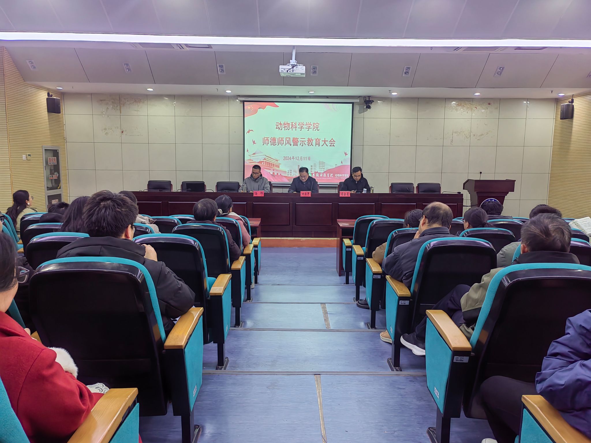 为进一步加强学院师德师风建设,12月11日下午,动物科学学院在图书馆一楼报告厅召开师德师风警示教育大会。学院党政领导及全体教职工参加会议。会议由学院党委书记甘宗平主持。
