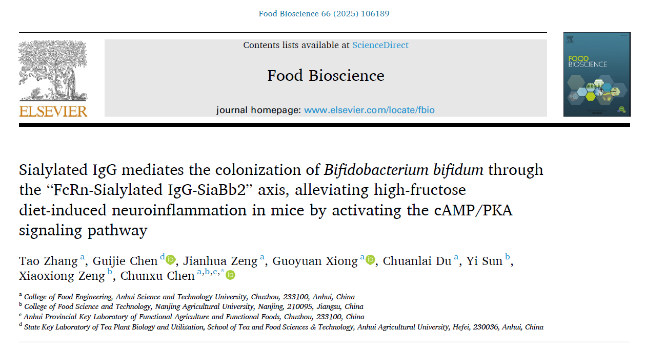 近日,食品科学与工程学院陈春旭副教授以通讯作者身份在国际Top期刊《Food Bioscience》(Q1,影响因子4.8)发表了题为“Sialylated IgG mediates the colonization ofBifidobacterium bifidumthrough the “FcRn-Sialylated IgG-SiaBb2” axis, alleviating high-fructose diet-induced neuroinflammation in mice by activating the cAMP/PKA signaling pathway”的研究论文,论文的第一作者为爱体育平台2023级食品加工与安全专业硕士研究生张涛,爱体育平台为第一完成单位,南京农业大学曾晓雄教授课题组为合作单位。
