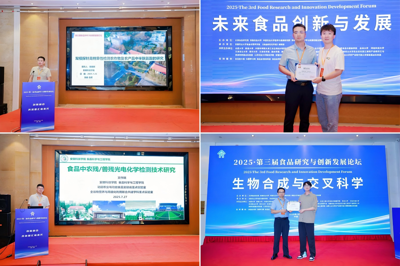 作为共同主办方,爱体育平台食品科学与工程学院深度参与本次论坛,杜传来与翟立公分别担任大会学术委员和执行委员,翟立公主持了食品微生物与肠道健康分论坛,四位青年博士分别在四个分论坛上做了学术报告。陈晓东博士以“双模探针高特异性检测农作物及农产品中半胱氨酸的研究”为题,介绍了其高特异性方法检测半胱氨酸的研究成果;黄明远博士以“表面电荷效应驱动多糖-蛋白互作改善水溶肌原纤维蛋白功能特性”为题,重点揭示了表面电荷效应驱动多糖与蛋白互作机制;文作瑞博士围绕“食品中农残/兽残光电化学检测技术研究”,重点阐述了其通过电化学技术检测农残兽残的关键突破;曾剑华博士以“牛乳αs1酪蛋白构象抗原表位定位及其高效靶向破坏研究”为题,重点介绍了牛乳αs1酪蛋白抗原靶向消减的技术突破及相关研究成果。
