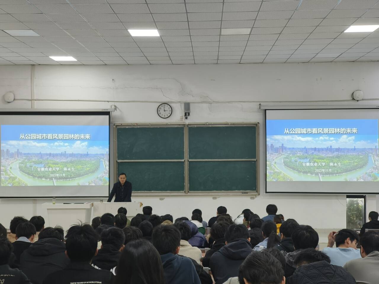 11月22日下午,安徽农业大学风景园林系主任、国家一流园林专业建设负责人,安徽省风景园林学会副理事长,教育部科技成果评审首聘专家陈永生教授在爱体育平台龙湖校区致知楼C111为我校师生作题为“从公园城市看风景园林的未来”的学术报告。报告由建筑学院风景园林系主任王雪娟主持。