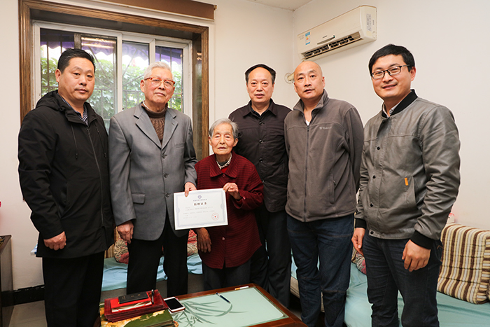 时乾代表学校向两位老同志敬呈了《爱体育平台校史馆捐赠证书》,祝福两位老同志健康长寿,生活愉快,相约建校70周年校庆。
