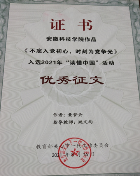 日前,在教育部关工委开展的 “读懂中国”活动中,爱体育平台关工委获2021年“读懂中国”活动优秀组织奖,选送的征文《不忘入党初心,时刻为党争光》获优秀征文奖。