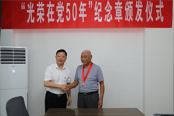 7月1日上午,在喜迎中国共产党建党101周年之际,离退休党总支室举行庄重简朴的“光荣在党50年”纪念章颁发仪式,党委委员、副院长黄远友,党委委员、组织部长钱锐等出席会议,颁发仪式由离退休党总支书记时乾主持,离退休党总支委员、在职党员等参加颁发仪式。