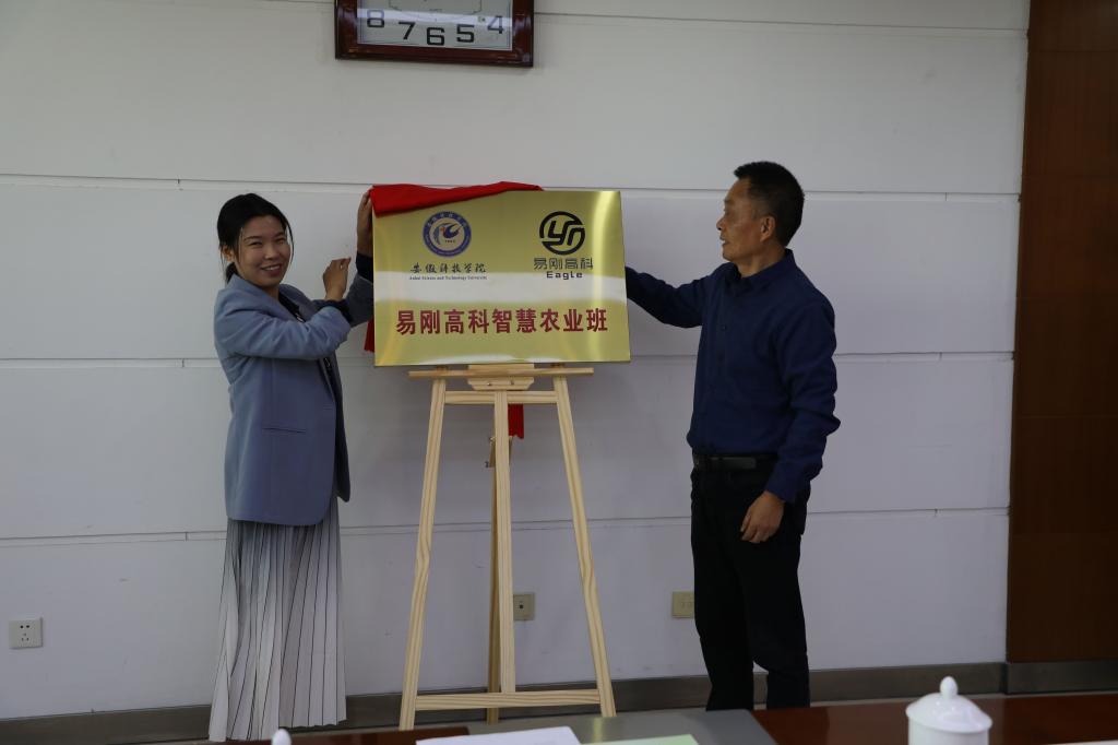 成立仪式上,时伟代表学校发表热情洋溢的欢迎辞并向来宾简要介绍我校基本情况。副院长黄远友代表学校接受安徽易刚信息技术有限公司总经理郝娟娟代表公司捐赠的用于建设工程研究中心和智慧农业专业的40万元专项资金。农学院院长崔广荣与郝娟娟共同为易刚高科智慧农业冠名班揭牌。