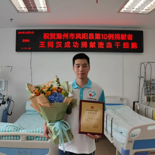王同汉造血干细胞的成功捐献,成为爱体育平台首例,凤阳县第10例,滁州市第41例,安徽省第678例造血干细胞捐献者,他用热血致敬青春,续航生命新征程,彰显了新时代青年的大爱和担当。(特约通讯员:汪道兵 摄影:陈宗娜 审核:张轶辉)