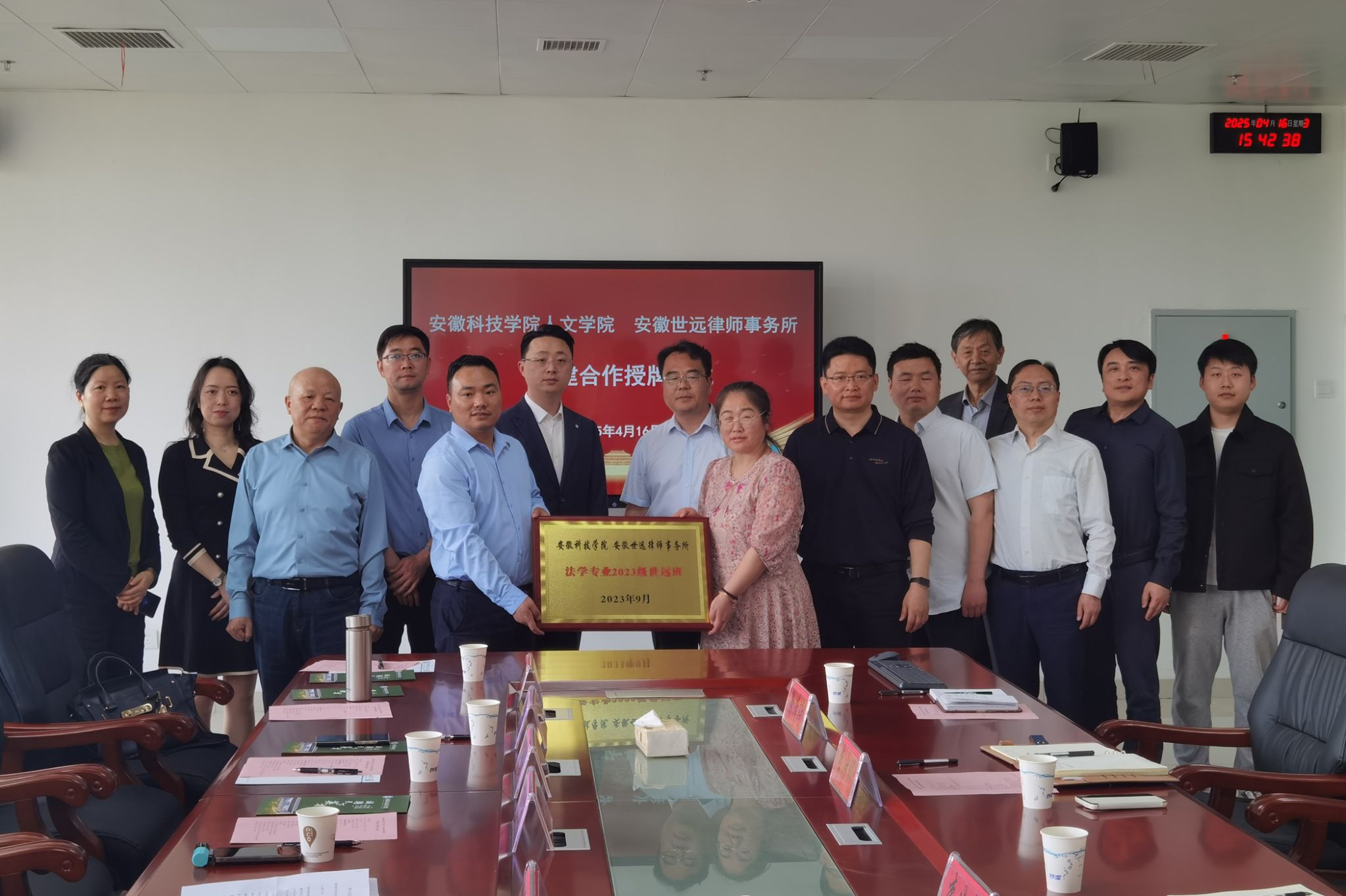 4月16日下午,人文学院与安徽世远律师事务所举行共建合作授牌仪式。安徽世远律师事务所执行主任段永梅,安徽世远(合肥)律师事务所主任程聪,合伙人王应选、侯培培,律师黄保轩、宫厚军、张大成、唐雯、张文艳;人文学院党委副书记、院长李晓东,副院长牛永辉,党委副书记李沙娜,法学系教授骆绪刚,辅导员徐琦琦出席。仪式由牛永辉主持。