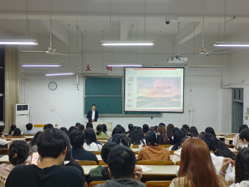 为深化学院学子地域认知,传承中华优秀传统文化,进一步增强文化自信,9月26日晚,人文学院于求知楼A107教室开展“2023,遇见凤阳——给你爱上凤阳的理由”主题讲座。特邀凤阳县文化和旅游局党组成员、凤阳明中都皇故城国家考古遗址公园管理处主任郭如亮主讲。中文系教师苏浩东、曹宋艳及汉语言文学22级全体同学参加。讲座由中文系主任苏兆龙主持
