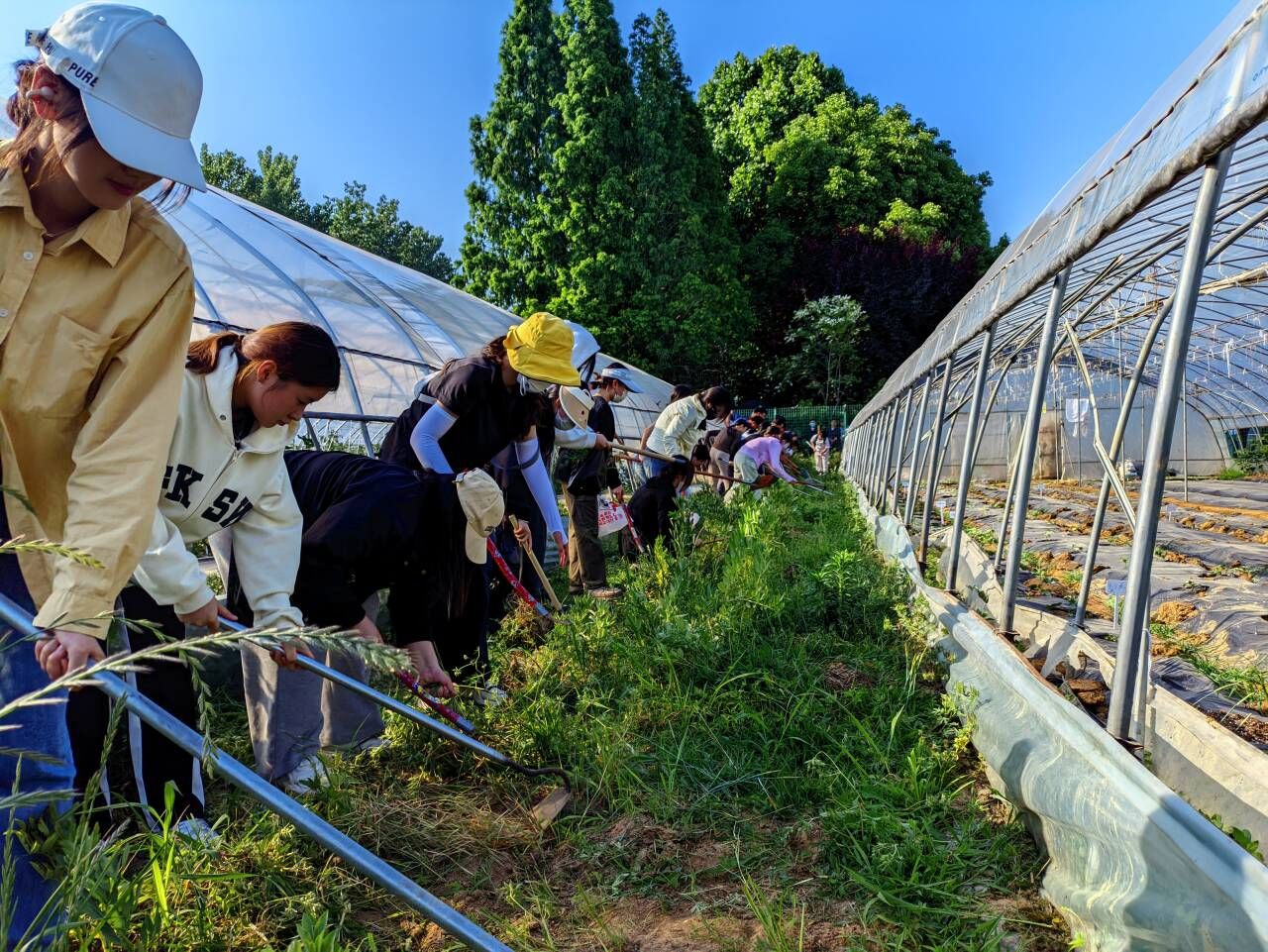 在农场劳动体验活动中,汉语言文学234班同学在辅导员焦雪松老师的带领下,在凤阳校区农学院种植园参与农业生产劳动。同学们热情高涨,手持锄头、铁锹和镰刀,精神饱满地投入到锄草工作中。经过清理,原本被杂草掩盖的土地重新焕发出勃勃生机。
