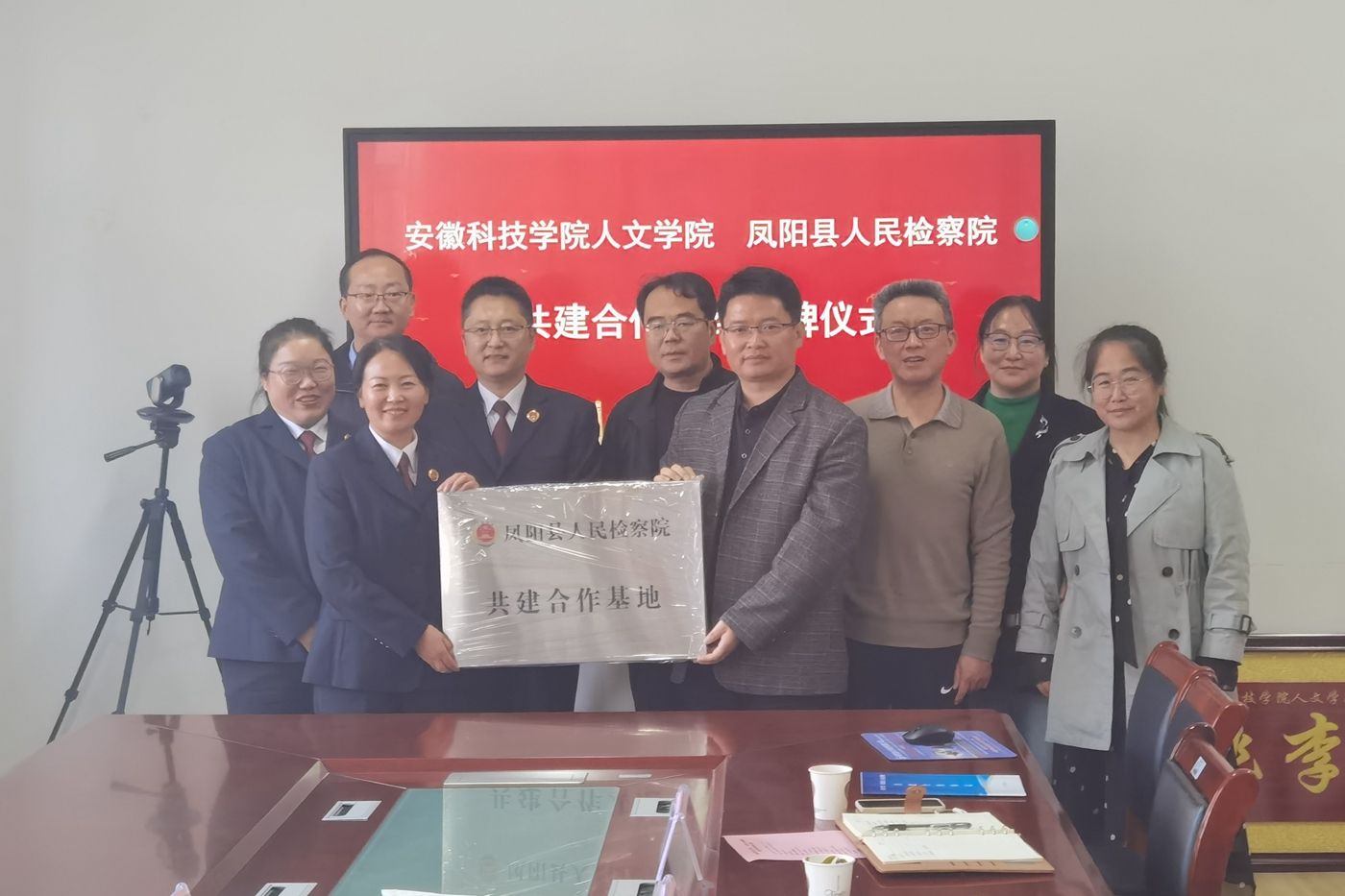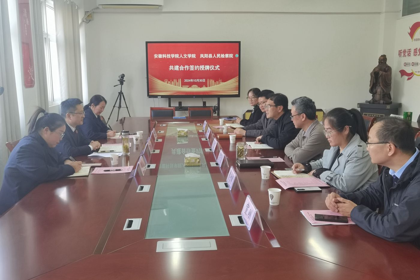 10月30日下午,凤阳县人民检察院党组书记、检察长张杏喜,副检察长李艳、研究室主任程雨一行来校签署共建合作协议。人文学院党委副书记、院长李晓东,正处级组织员张严政,副院长牛永辉,党委副书记、纪委书记李沙娜,法学系主任张晓云,模拟法庭主任宣刚出席仪式。仪式由张严政主持。