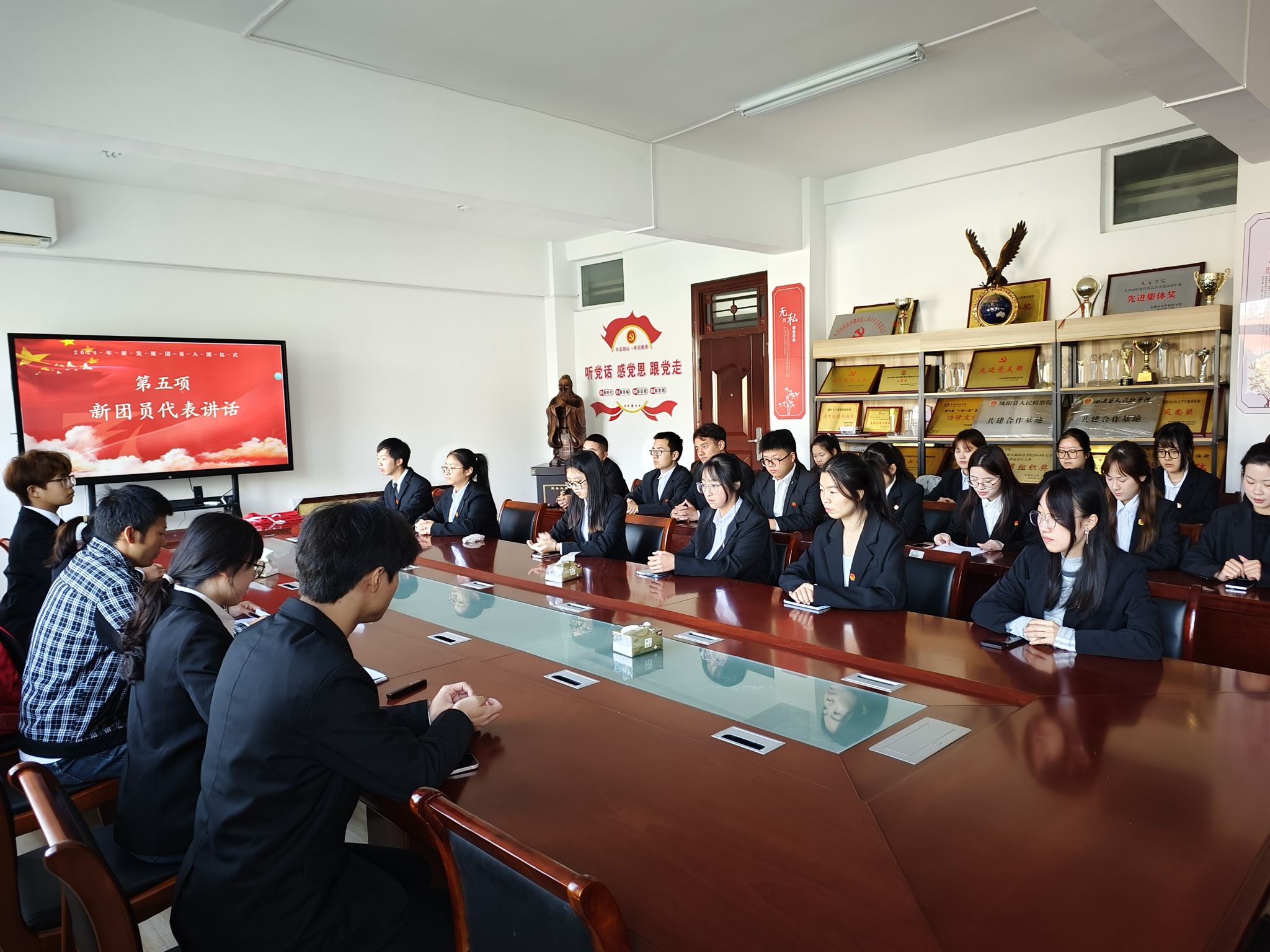 新团员入团仪式在庄严的国歌声中拉开帷幕。雷陶红宣读了2024年新发展团员名单,团员代表们为新团员颁发了共青团团徽;汉语言文学233班王中华和法学234班赵丹丹分别代表老团员和新团员发言,号召学院全体共青团员自学加强理论学习 ,努力学习文化知识、提高专业技能,在学习和实践中不断坚定理想信念、增长知识才干,用实际行动践行共青团员的责任担当和时代使命。