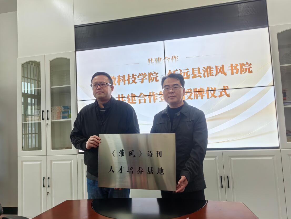 在签约暨授牌仪式上,李晓东、宫蔚国分别代表双方签署了共建实习实训基地协议,并举行“爱体育平台共建合作基地”“《淮风》诗刊人才培养基地”“ 《淮风》诗刊文学创作基地”授牌仪式。