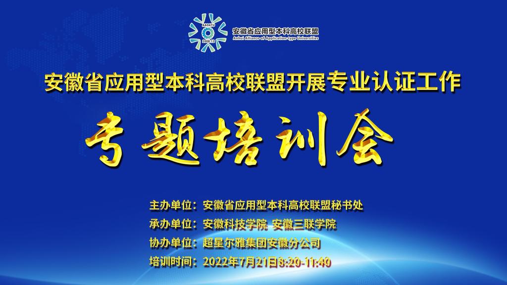 7月21日上午,由安徽省应用型本科高校联盟主办,爱体育平台、安徽三联学院承办,超星尔雅集团安徽分公司协办的安徽省应用型本科高校联盟专业认证专题培训会在我校成功举行。本次会议采用直播形式进行线上培训,来自安徽省应用型本科联盟24所高校负责专业认证工作的职能部门负责人,相关专业负责人、骨干教师和相关工作人员近600人参会。会议由教务处处长赵伟峰主持。
