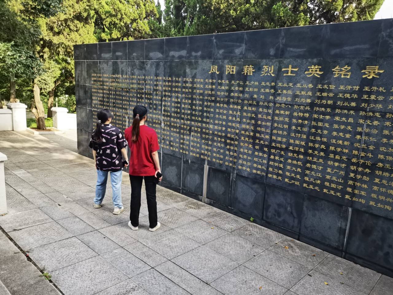 凤阳县烈士陵园始建于1959年,位于府城镇东北部第一山南麓,占地面积约199.8亩,内建有烈士纪念碑、烈士陵墓、英烈广场、展示厅等纪念建筑,团队成员们进入烈士陵园后被陵园中庄严肃穆的气氛所感染。目前长眠在烈士陵墓内的凤阳籍革命烈士85名,无名烈士270名,团队成员们看着一尊尊墓碑,无一不为之动容,正是有这一位位烈士的牺牲,才换来如今的美好生活。烈士陵园的展示厅主要以红色为主基调,团队成员们在展示厅内驻足观望良久,阅读着一个个英雄故事、观摩着一件件战争时期的老物件,英雄的形象仿佛鲜活起来。最后,团队成员们怀着敬仰之情站在革命雕塑前,向革命先烈行三鞠躬礼,默哀三分钟,共同凭吊烈士英灵,向长眠在此的烈士表达深深的哀思和无尽的怀念。