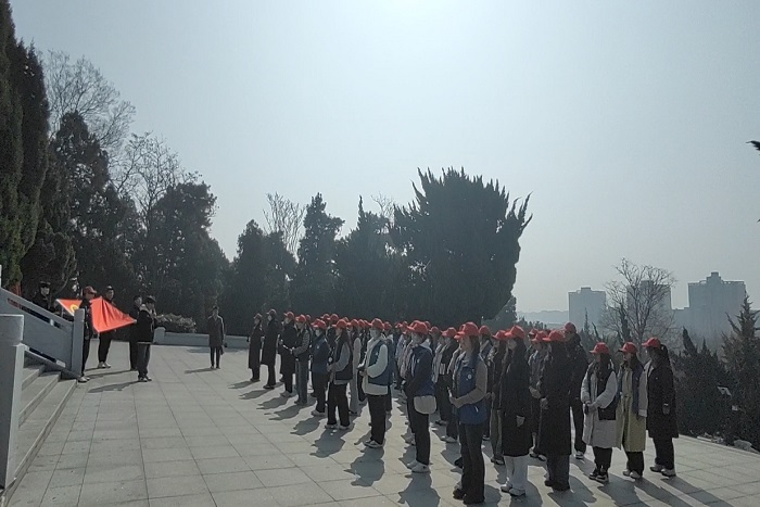 为加强大学生爱国主义教育,发扬志愿服务精神,3月13日下午,外国语学院翻译专业学生党支部、英语专业学生党支部师生党员、入党积极分子和2022-2023级团支部团员青年共80人在学院团委副书记宋兵兵带领下赴凤阳县烈士陵园开展“祭奠英烈,清扫陵园”主题活动。