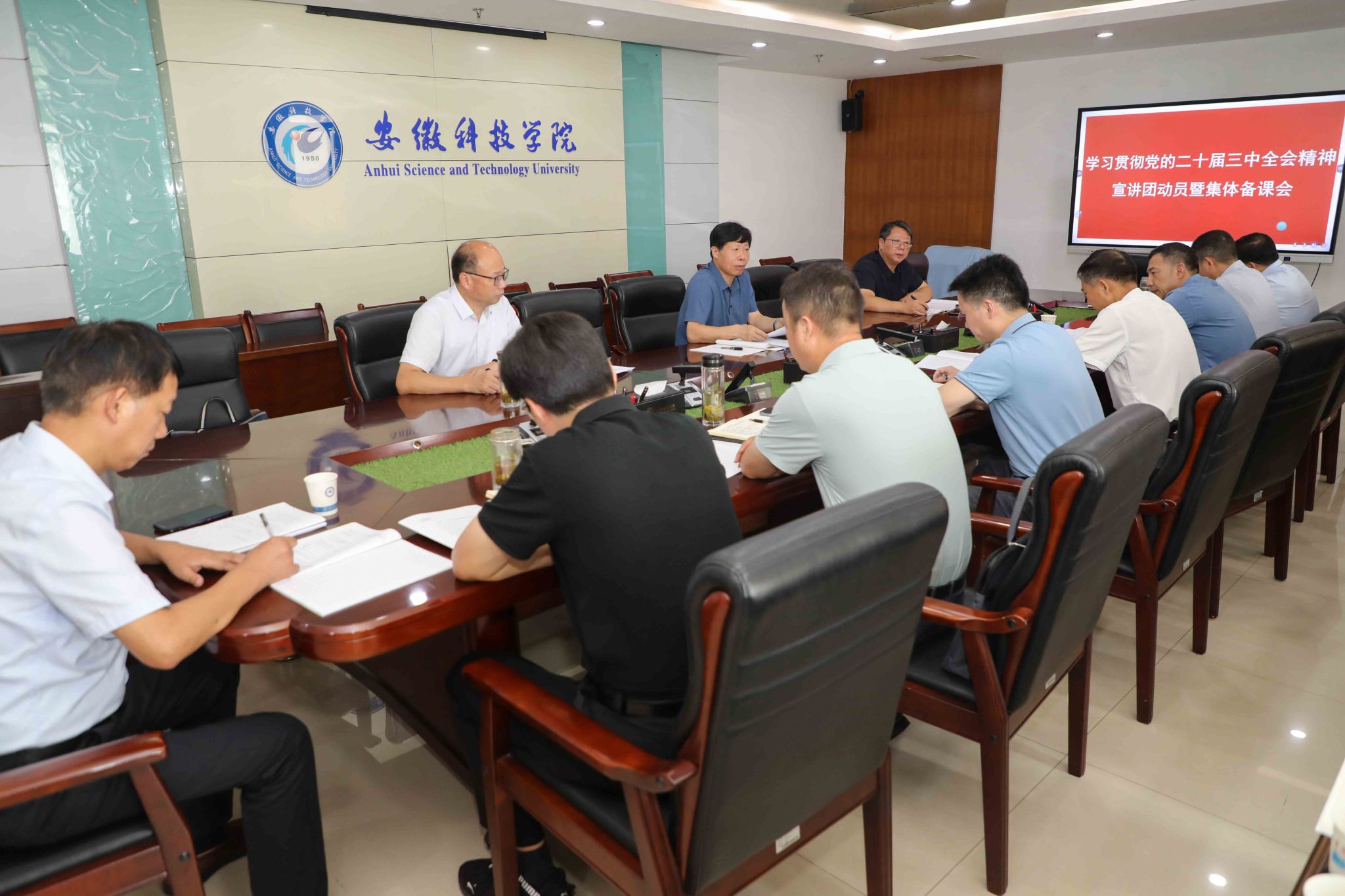 8月30日上午,校党委书记时伟在凤阳校区主持召开学习贯彻党的二十届三中全会精神宣讲团动员暨集体备课会。党委委员、副院长李升和,党委委员、副院长王孝义,党委委员、机关党委书记卫胜,党委委员、组织部部长钱锐,党委委员、宣传部部长何永勇,宣讲团全体成员和教务处、科研处主要负责同志参加会议。