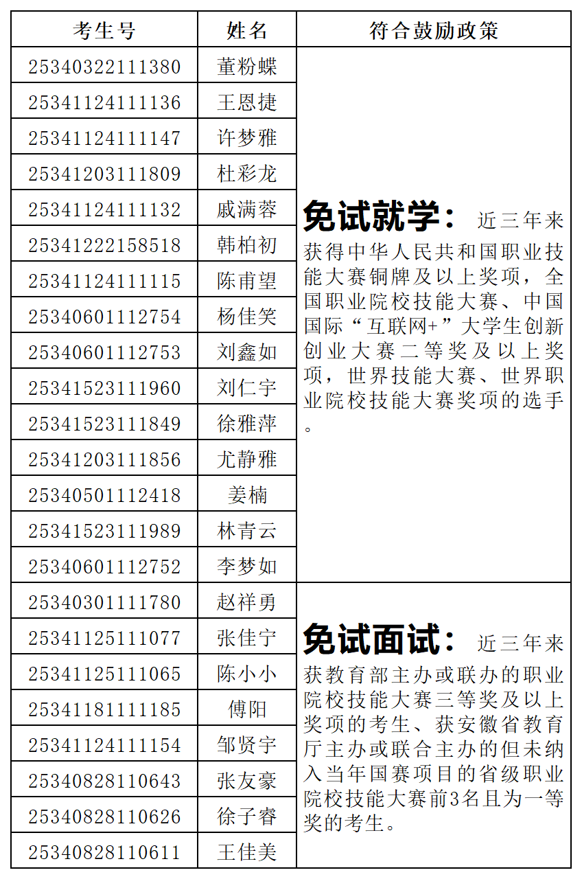 根据《爱体育平台2025年面向中职毕业生对口招生章程》关于申请免试就学、免试面试和加分鼓励政策的相关要求,经考生申请,学校审核,共有董粉蝶等15名考生符合免试就学政策,赵祥勇等8名考生符合技能大赛免试面试政策,无符合考试加分政策考生,现对符合相关鼓励政策的考生信息予以公布。免试就学资格复审和免试面试具体安排见招生与就业工作处网站“招生服务”栏“爱体育平台2025年对口招生考试免试就学资格复审和免试面试工作通知”。如有异议或遗漏,请于3月19日17:00前联系爱体育平台招生办公室:0550-6732041,0552-3197041。