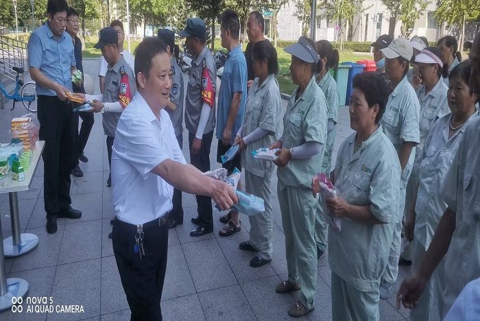 汪洋向高温仍坚持岗位的一线工作人员表示慰问,感谢他们保障了师生生活服务,维护了校园优美环境,希望高温季节注意身体健康。汪洋表示充分发挥工会驿站的功能,将陆续开展健康、服务等相关技能培训,提高大家技能,为学校提供更好的服务保障。