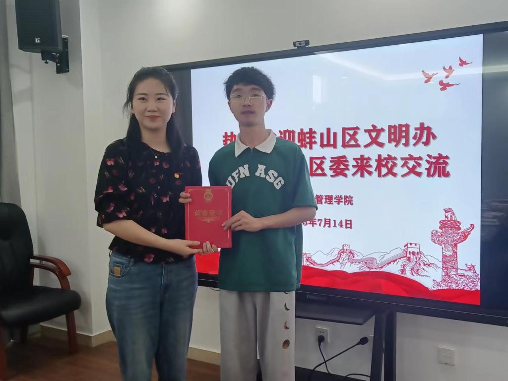 校团委书记张聪主持赠送仪式,仪式上,蚌山区文明办主任刘浩向管理学院党委副书记陶漫赠送感谢信。团蚌山区委书记张婷婷向优秀志愿者代表、管理学院朱一同学颁发社会实践证明和优秀志愿者证书。