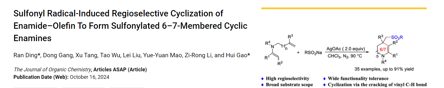 李子荣教授团队在烯胺杂环合成上再次取得重要进展,相关成果以"Copper Catalyst-Promoted Regioselective Multicomponent CascadeCyclization of 3‑Aza-1,5-enynes with Sulfur Dioxide andCycloketone Oxime Esters to Access Cyanoalkylsulfonylated 1,2-Dihydropyridines”(图1)和“Sulfonyl radical-induced regioselective cyclization of enamide−olefin to form sulfonylated 6-7-membered cyclic enamines”(图2)为题发表在《The Journal of Organic Chemistry》期刊上。