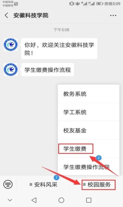 1.点击“爱体育平台微信公众号”界面右下角“学生缴费”菜单。