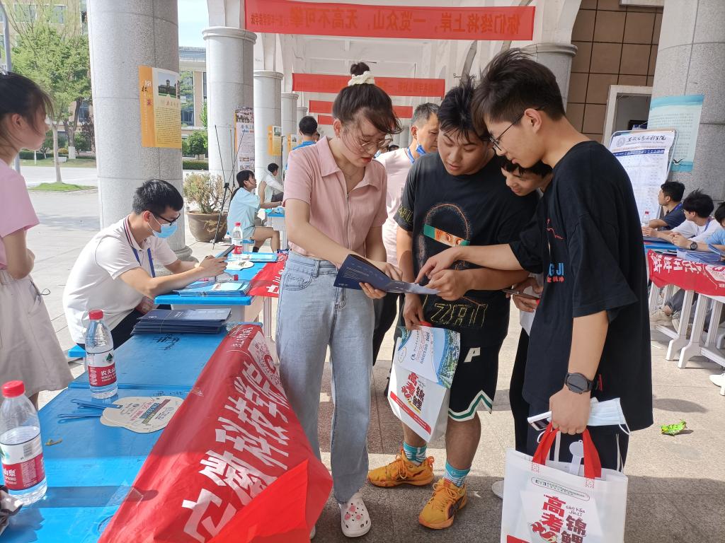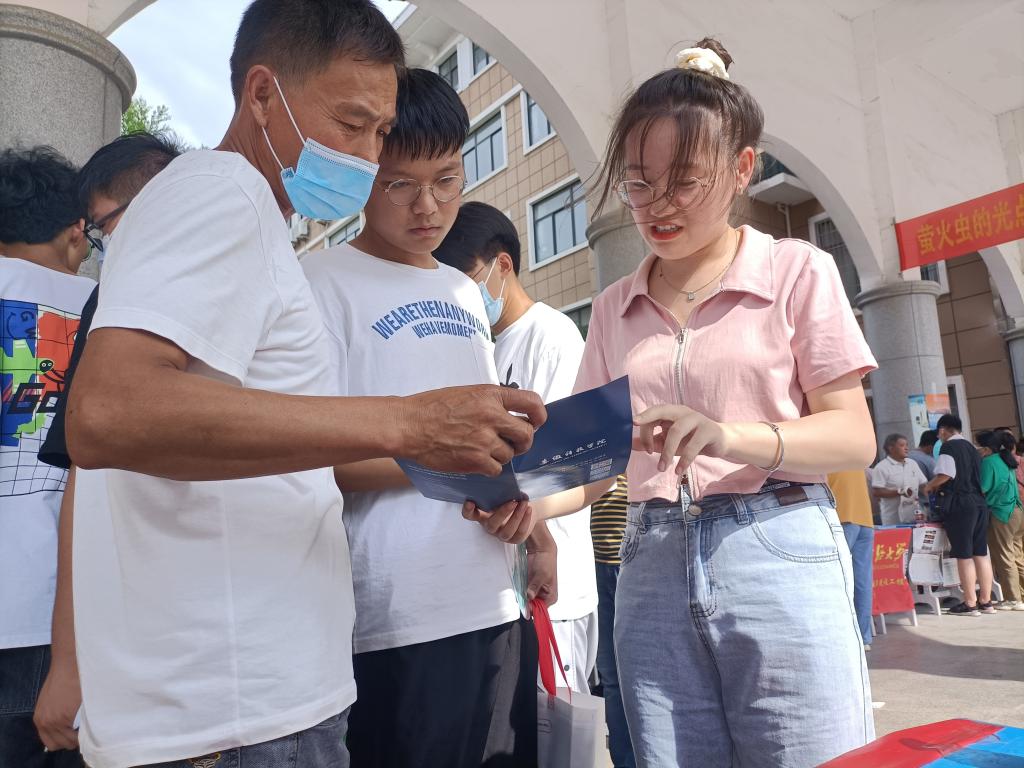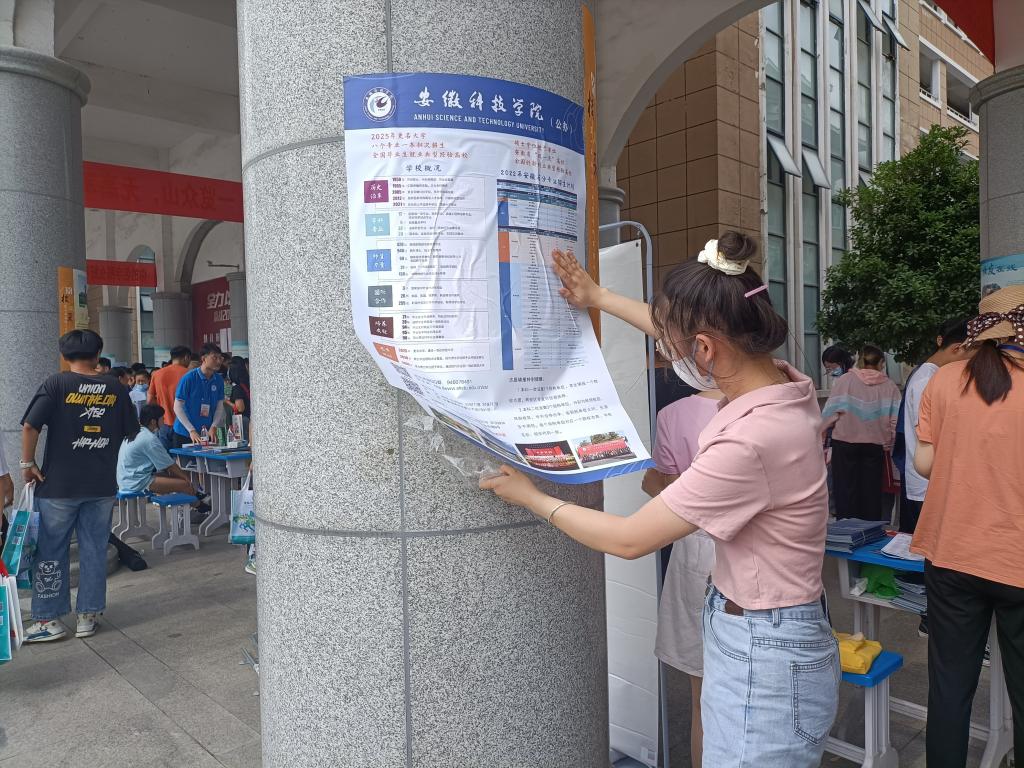 26日下午,烈日炎炎,沈悦骑行半小时来到凤台县第一中学,在高三教学楼,沈悦张贴安科招生海报之后,一边分发招生宣传册,一边热情地向学弟学妹们宣传安科优良学风,耐心解答大家关注的热点话题,分享自己的学习方法与志愿填报经验,为学弟学妹成长助力。