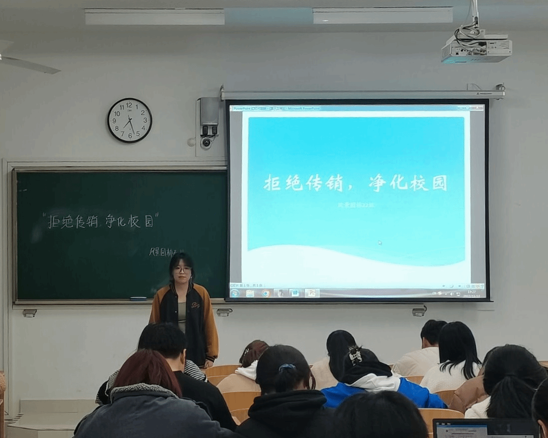 通过“拒绝传销,净化校园”主题班会的开展,提醒在校大学生警惕传销陷阱,认清传销违法犯罪活动的欺诈本质和严重危害性,提高了同学们的防范意识,自觉远离传销陷阱,为促进校园和谐稳定营造了良好的氛围。(特约通讯员:靳盼 摄影:柏雪 审核:谢宜勤)