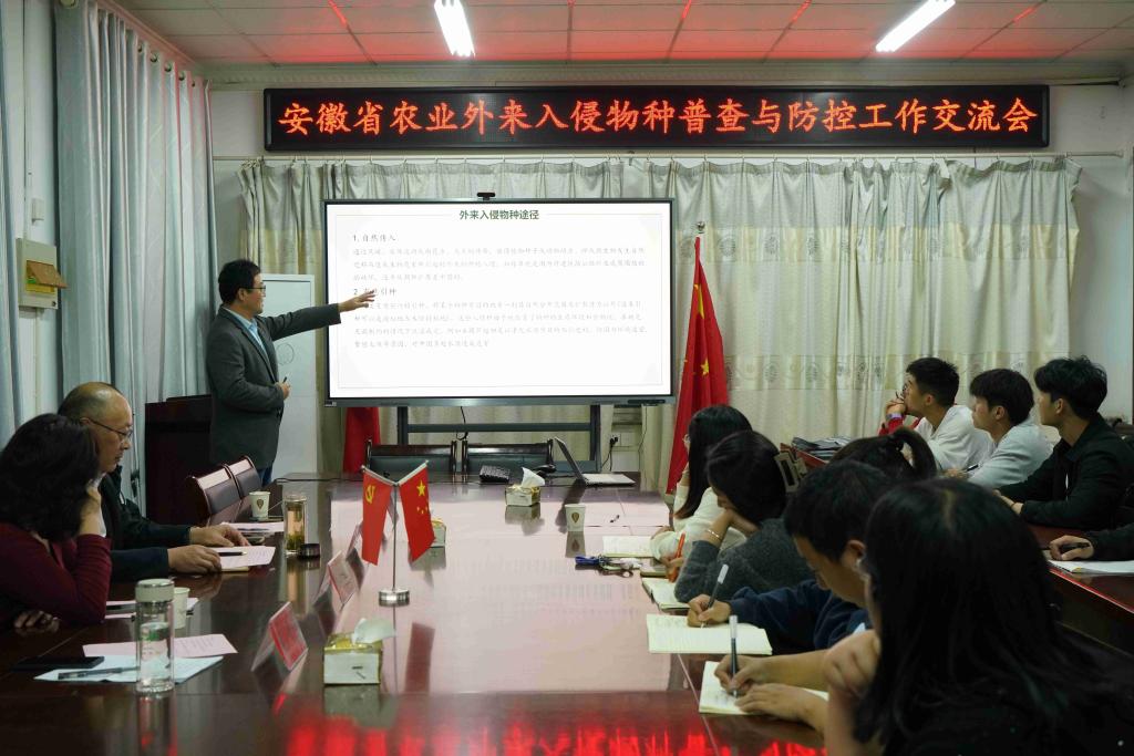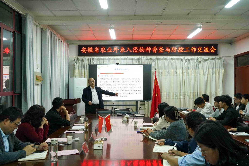 随后省农业外来入侵物种普查与防控工作交流会在农学院会议室召开。会议由何世潮主持,何世潮首先代表学院对各位领导专家赴校考察指导表示热烈欢迎及诚挚感谢,崔广荣和副院长李文阳分别介绍农学院整体情况和植物保护团队建设情况。殷雨虹对我校在省农业外来入侵物种普查与防控工作中所做的工作给予了高度肯定并表示感谢,希望我校在今后的省农业外来入侵物种常规监测及防控工作中继续提供强有力的技术支撑并期待开展更加全面深入地合作。何金铃高度评价了我校在省农业外来入侵物种普查中所做的工作,指出在全省农业外来入侵物种普查数据中,毕亚玲团队数据量丰富、信息记录较为完整、样地调查较规范、植物标本采集与制作优异。