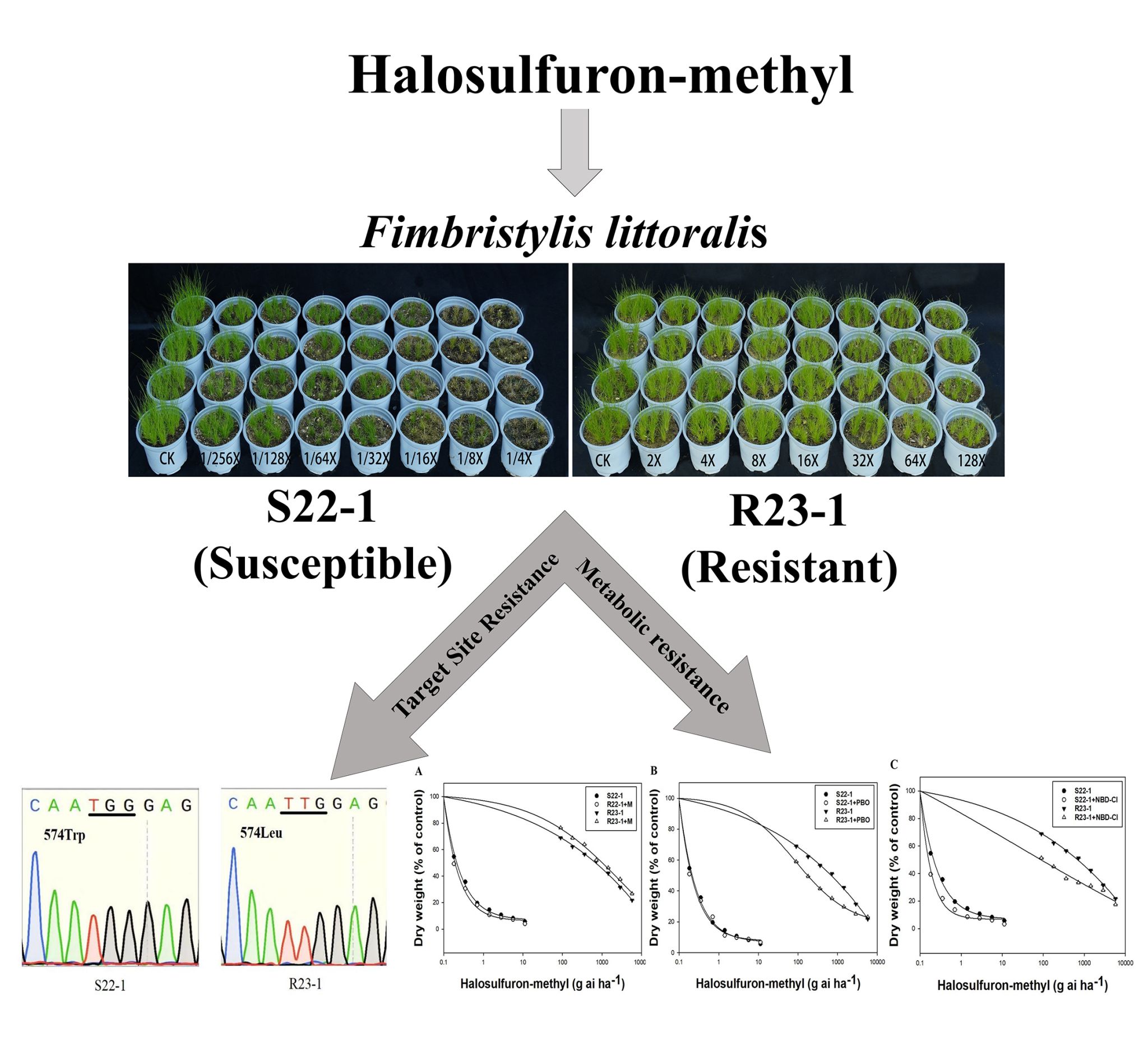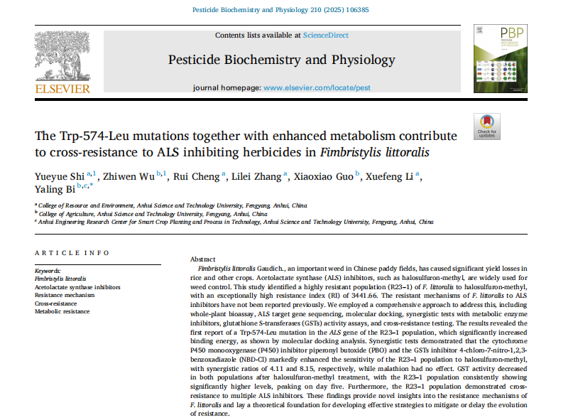 近日,我校农学院毕亚玲教授团队在国际知名期刊《Pesticide Biochemistry and Physiology》(中科院一区Top期刊,IF=4.2)发表了题为“The Trp-574-Leu mutations together with enhanced metabolism contribute to cross-resistance to ALS inhibiting herbicides inFimbristylis littoralis”的研究论文。该研究首次揭示了稻田恶性杂草水虱草(Fimbristylis littoralis Gaudich.)对乙酰乳酸合成酶(ALS)抑制剂类除草剂的抗性机制。硕士研究生史悦悦和青年教师吴志文博士为共同第一作者,毕亚玲教授为通讯作者,爱体育平台为唯一完成单位。