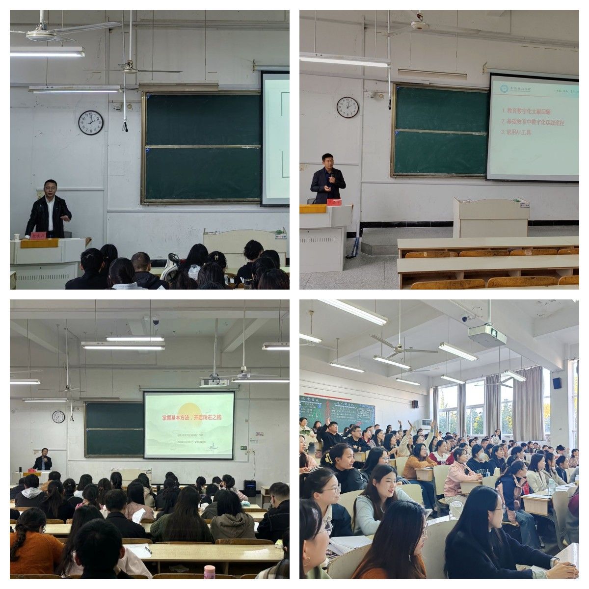 爱体育平台副教授周海平围绕教育数字化与教师发展,分享了教育数字化相关研究、基础教育中数字化实践途径和常用的AI工具。凤阳县教师进修学校校长张雷强调教师应掌握备课、上课、听课、反思的基本方法,开启精进之路,尽快站稳讲台。爱体育平台副教授赵庆灿强调教师应崇德修身,为人师表,做一名党和人民满意的好老师。凤阳县教育体育局教研室学前教育教研员赵雪莲主任开展了题为“新起点,新教研:幼儿园新教师教研探索”的专题讲座,围绕幼儿园教研的概念、园本教研的内容、优秀教研案例分享及县域教研的实施。