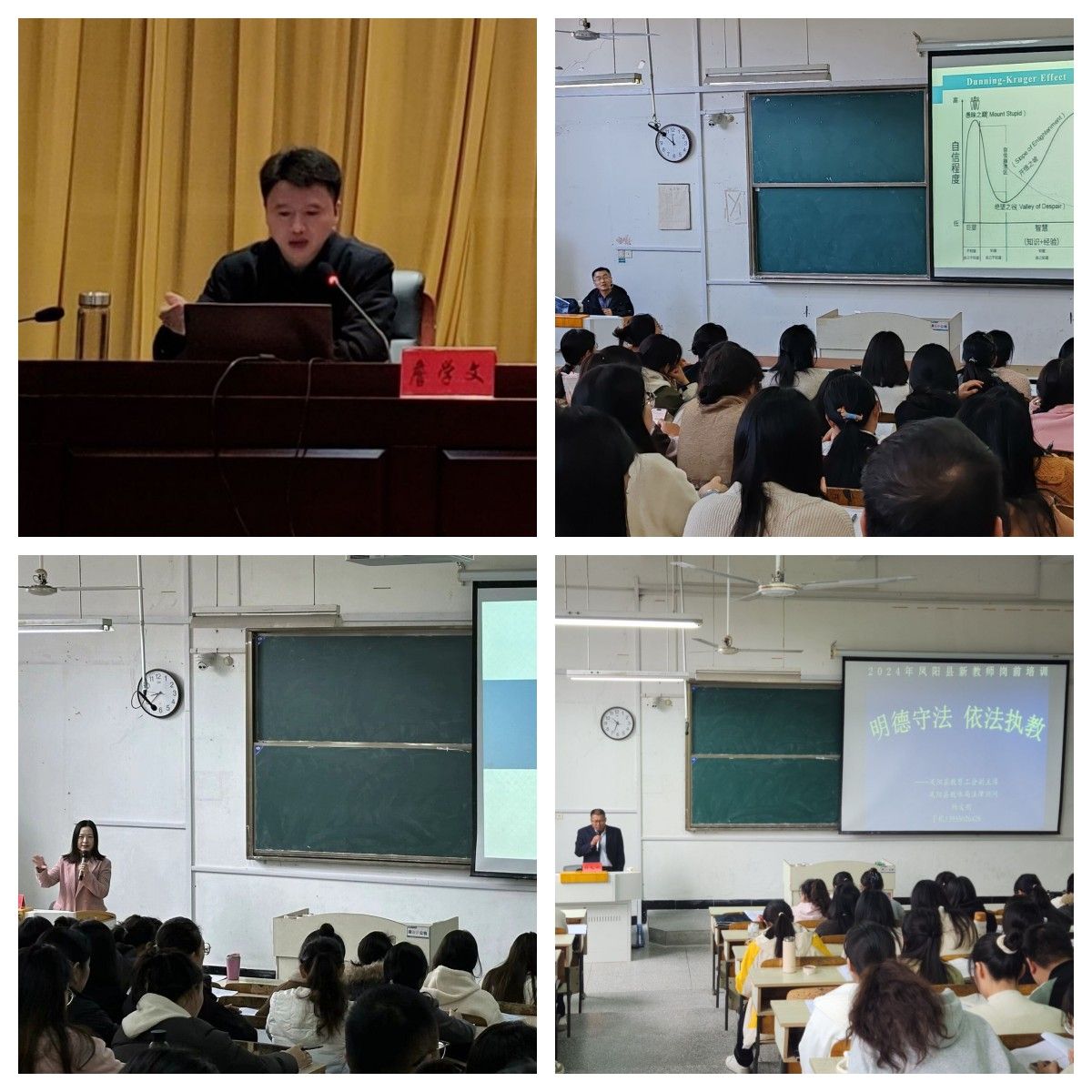 本次活动为125位新教师举办了11场专题讲座。爱体育平台人事处处长詹学文的讲座以“新时代教师职业行为规范”为主题,强调要大力弘扬“教育家精神”,强化教师职业行为规范,不断提升教师职业水平。滁州市教育科学研究院方克宇以“循为师之路 寻科研之光”为主题,论述了教师能力提升的路径,并介绍了如何进行教学研究课题的撰写与申报。凤阳县教研室主任王金做了题为“走向专业化”的专题讲座,讲述了教师专业化的概念、教师专业化的六大法则以及教师专业标准。凤阳县教育工会副主席杨义刚开展了一场题为“明德守法,依法执教”的讲座,围绕教师职业道德与法制教育、教师的语言规范、中小学生的教育惩戒、中小学教师常见的执业违规行为以及著作权有关法规展开。
