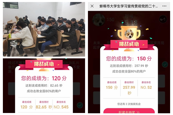 本次竞赛主要是通过登陆“蚌埠青年”微信公众号设置的线上答题平台进行,参赛选手使用手机扫描二维码参与线上竞赛,每次答题从题库中随机抽取15题,每题限时30秒。本次党的二十大精神理论知识竞赛共有24个班级,730多个同学参加,全院学生参与度高,答题正确率较高,学习效果较好。