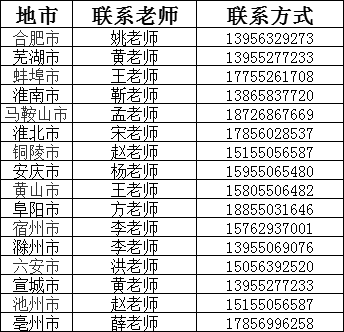 学校在安徽省16个地市,分别派驻招生工作组,进中学开展招生宣讲、志愿填报辅导。各地市招生工作组联系方式如下,欢迎广大同学咨询。