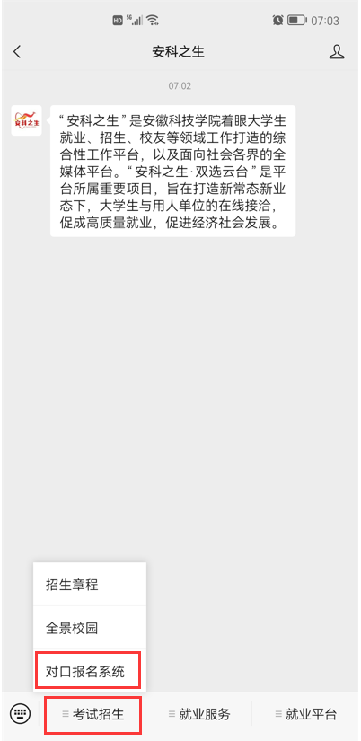 第一步:请扫描下方二维码,关注爱体育平台招生办公室官方微信公众号“安科之生”,选择“考试招生”菜单,点击“对口报名系统”。