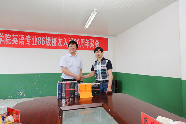 座谈会后,校友向外国语学院捐赠了英语原版书籍和书法作品等礼物,并进行了重走校园路活动。(特约通讯员:张海亮)