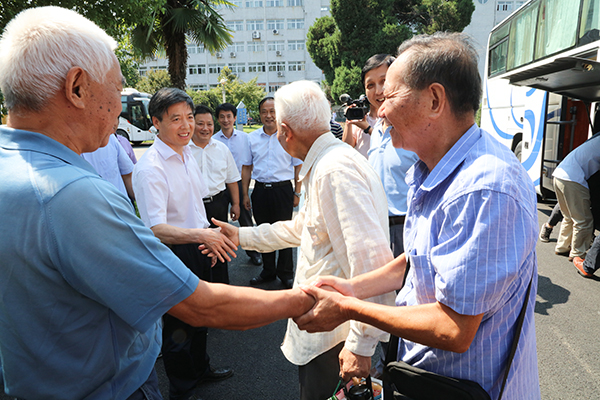 9号临近中午,当载着安农大老教师的大巴驶入凤阳校区校园刚停下,在此迎候多时的蒋德勤、李震、郭亮等校领导就快步上前,与下车的老同志们一一握手、亲切问候,表达敬意,并邀请老同志们一起合影留念。青年教师和学生代表也向各位老教师献上美丽的鲜花,提前祝各位老同志教师节快乐。
